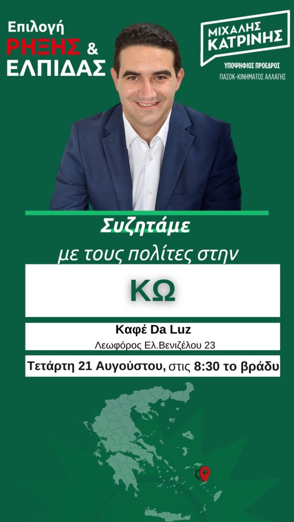 Ο υπ. Πρόεδρος του ΠΑΣΟΚ κ. Μιχάλης Κατρίνης επισκέπτεται την Τετάρτη 21 Αυγούστου την Κω, συνεχίζοντας την επικοινωνία του με τους πολίτες. Με το μήνυμα «Συζητάμε με τους πολίτες» ο Μιχάλης Κατρίνης διοργανώνει ανοιχτή συγκέντρωση και συζήτηση με τους πολίτες στις 8:30 το βράδυ, στο καφέ “DA LUZ”, Λ. Ελ. Βενιζέλου 23.
