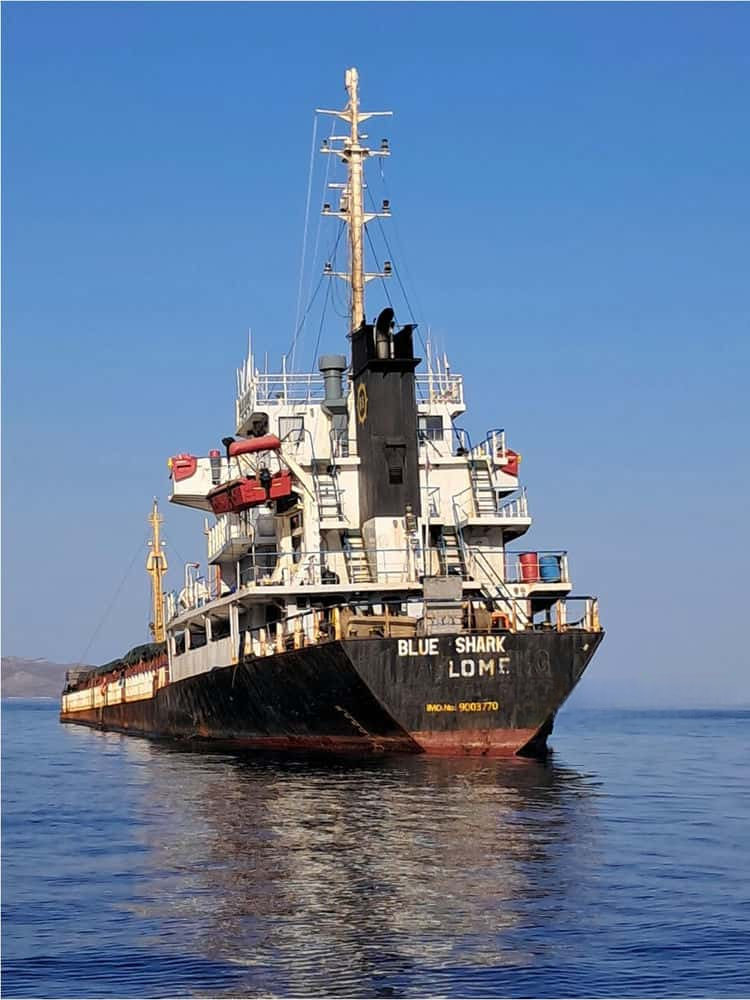 Πριν 9 μήνες περίπου (2 /1/2024) προσέκρουσε αλιευτικό σκάφος στο πλοίο «BLUE SHARΚ», καθώς το τελευταίο δεν διέθετε φώτα καταστρώματος – αγκυροβολίας λόγω βλάβης Η/Ζ. Το πλοίο κάποια στιγμή άρχισε να παίρνει νερά και πριν 4 μήνες στις 18-05-2024