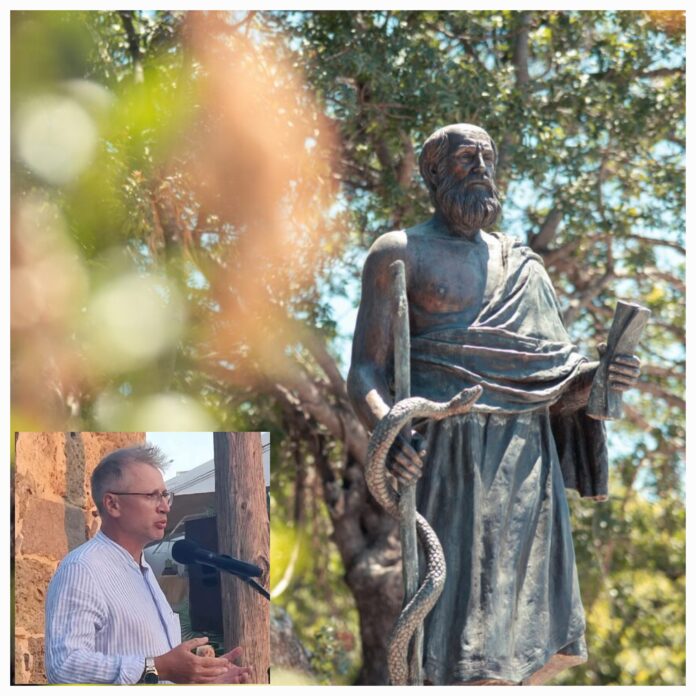 «Για να πάμε στην πρώτη πράξη αυτού του έργου δεν θα πρέπει να ταξιδέψουμε ένα χρόνο πίσω αλλά δύο, στη στιγμή κατά την οποίαν με τον Πρόεδρο του Συλλόγου Ποντίων Κω «Ξενιτέας» και νυν Αντπεριφερειάρχη κύριο Μπάμπη Ναβροζίδη, που είχαμε συνεργαστεί και κατά την τοποθεσία του μνημείου ποντιακού ελληνισμού στο ομώνυμο πάρκο στην πόλη της Κω, ατενίζαμε το σημείο που βρίσκεται ο Πλάτανος του Ιπποκράτη και αναρωτιόμασταν, με μια δόση χιούμορ αλλά και βαθειάς επιθυμίας, πόσο μοναδικό θα ήταν να καταφέρναμε να χαρίζαμε στο εκεί σημείο κι ένα μεγαλοπρεπές άγαλμα του πατέρα της Ιατρικής. Λίγα λεπτά αργότερα και κατά σατανική σύμπτωση, δέχθηκα μία κλήση από τον ευεργέτη μας και μεγάλο Έλληνα της διασποράς κύριο Δημήτριο Τάσσιο, ο οποίος και μου εξεδήλωσε την επιθυμία του να δωρίσει ένα άγαλμα που θα αναφέρεται στον Ιπποκράτη και θα αφορά την περιοχή του Πειραιά. Εξεπλάγην με την σύμπτωση και αντιλήφθηκα ότι το Σύμπαν κάτι προσπαθεί να μου πει. Να μην τα πολυλογούμε πείσαμε τον κ. Τάσσιο ότι έχουμε το κατάλληλο σημείο κι αυτό δεν είναι άλλο από το σημείο που εν τέλει τοποθετήθηκε αυτό το μεγαλοπρεπές άγαλμα του Ιπποκράτη. Βέβαια θα ήθελα να εκφράσω και μια μικρή πικρία για το γεγονός ότι ένα χρόνο μετά, ακόμη δεν έχουν καταφέρει στο Δήμο της Κω να φωτίσουν το άγαλμα με αποτέλεσμα να μένει σκοτεινό και να μην φαίνεται ειδικότερα τις βραδυνές ώρες. Θα έπρεπε αυτό το άγαλμα να στέκει εκεί, λαμπερό ως άσβεστο φάρος που θα λάμπει όχι μόνο απ’ το φως αλλά προπαντός στις καρδιές των επισκεπτών ότι είχαν την τιμή να επισκεφθούν την πατρίδα του Πατέρα της Ιατρικής. Ας ελπίσουμε να φωτιστεί σύντομα για να αναδειχθούν όλες οι λεπτομέρειες της τεχνοτροπίας του αγάλματος», μερικά απ’ όσα δήλωσε ο κ. Κικώτης.