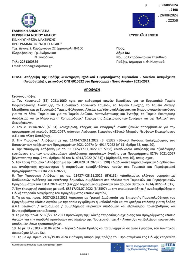 Απορρίφθηκε η αίτηση χρηματοδότησης ύψους 750.000 ευρώ που αφορούσε τη συντήρηση του σχολικού συγκροτήματος Γυμνασίου-Λυκείου Αντιμάχειας.Οι λόγοι της απόρριψης αναφέρονται στο επίσημο έγγραφο, το οποίο μπορείτε να δείτε παρακάτω. Παρόλα αυτά, ο Δήμος διατηρεί το δικαίωμα υποβολής ένστασης, δίνοντας ελπίδα για επανεξέταση της αίτησης και πιθανή έγκριση της χρηματοδότησης. Αναμένονται εξελίξεις τις επόμενες ημέρες.