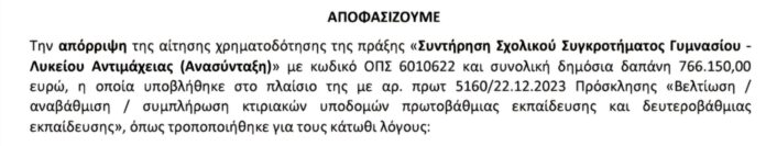 Απορρίφθηκε η αίτηση χρηματοδότησης ύψους 750.000 ευρώ που αφορούσε τη συντήρηση του σχολικού συγκροτήματος Γυμνασίου-Λυκείου Αντιμάχειας.Οι λόγοι της απόρριψης αναφέρονται στο επίσημο έγγραφο, το οποίο μπορείτε να δείτε παρακάτω. Παρόλα αυτά, ο Δήμος διατηρεί το δικαίωμα υποβολής ένστασης, δίνοντας ελπίδα για επανεξέταση της αίτησης και πιθανή έγκριση της χρηματοδότησης. Αναμένονται εξελίξεις τις επόμενες ημέρες.