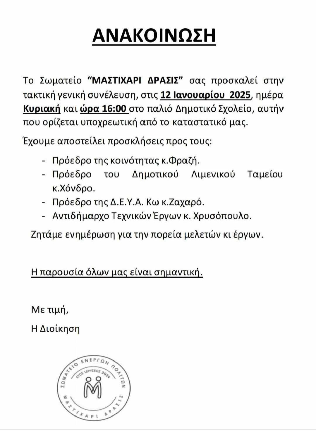 Το Σωματείο «ΜΑΣΤΙΧΑΡΙ ΔΡΑΣΙΣ» ανακοινώνει τη διεξαγωγή της τακτικής γενικής συνέλευσης, η οποία θα πραγματοποιηθεί την Κυριακή 12 Ιανουαρίου 2025, στις 16:00, στο παλιό Δημοτικό Σχολείο του Μαστιχαριού. Η συνέλευση αυτή αποτελεί υποχρεωτική διαδικασία, σύμφωνα με το καταστατικό του σωματείου.Στη συνέλευση έχουν προσκληθεί και αναμένεται να δώσουν το «παρών» σημαντικοί φορείς της τοπικής αυτοδιοίκησης και υπηρεσιών, προκειμένου να ενημερώσουν τα μέλη του σωματείου και τους κατοίκους για την εξέλιξη μελετών και έργων στην περιοχή. Συγκεκριμένα, προσκλήσεις έχουν σταλεί στους:Πρόεδρο της Κοινότητας Μαστιχαριού, κ. Φραζή.Πρόεδρο του Δημοτικού Λιμενικού Ταμείου, κ. Χόνδρο.Πρόεδρο της Δ.Ε.Υ.Α. Κω, κ. Ζαχαρό.Αντιδήμαρχο Τεχνικών Έργων, κ. Χρυσόπουλο.Τα μέλη του σωματείου αναμένουν με ενδιαφέρον την ενημέρωση και τις τοποθετήσεις των προσκεκλημένων σχετικά με την πρόοδο των έργων που αφορούν τη βελτίωση των υποδομών και των υπηρεσιών της περιοχής.Η γενική συνέλευση αποτελεί μια σημαντική ευκαιρία για τη διαμόρφωση κοινού οράματος και την ενίσχυση της συνεργασίας μεταξύ πολιτών και τοπικών αρχών, με στόχο τη βιώσιμη ανάπτυξη του Μαστιχαριού.