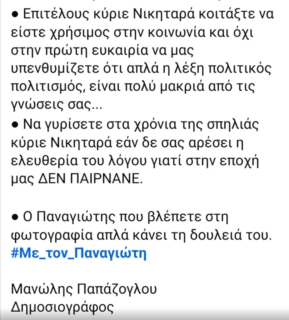 Ως Δήμαρχος, αλλά και η δημοτική αρχή στο σύνολό της, με αυτές τις αρχές πορευόμαστε.Υπηρετούμε ξεκάθαρα τα συμφέροντα του Κωακού λαού και σε αυτόν λογοδοτούμε.Δεν εκβιαζόμαστε και δεν υποχωρούμε, σε κανέναν και σε τίποτα που δεν υπηρετεί το συμφέρον του τόπου μας.Είτε πρόκειται για παράγοντες που ασκούν εξουσία, είτε αφορά σε άδηλους σκοπούς που προάγονται μέσω ΜΜΕ.Θα είχε δε ιδιαίτερο ενδιαφέρον να ακουστεί η άποψη του ΣΕΜΜΕΚ και η καταδίκη της δημόσιας δήλωσης δημοσιογράφου της Ρόδου σε γνωστό ΜΜΕ, με την οποία καλεί τον δήμαρχο Κω “να πάει να ζήσει σε σπηλιά”. Δίνουμε για αυτό το λόγο στη δημοσιότητα, το σχετικό απόσπασμα.