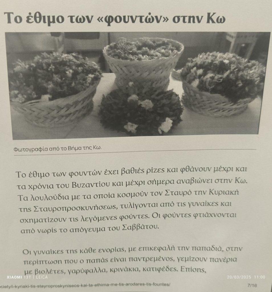 Για το έθιμο μίλησε στα παιδιά ο π. Κωνσταντίνος Κουκούλας από τον Ιερό ναό Αγίου Νικολάου και φυσικά η διευθύντρια του σχολείου Χρύσα Κιαρη που είχε την πρωτοβουλία. Τα παιδιά μαζί με γονείς και γιαγιάδες έφτιαξαν “φούντες ” και σταυρούς για να τιμήσουν το έθιμο, ανά τμήμα μαζί με τις δασκάλες τους.
