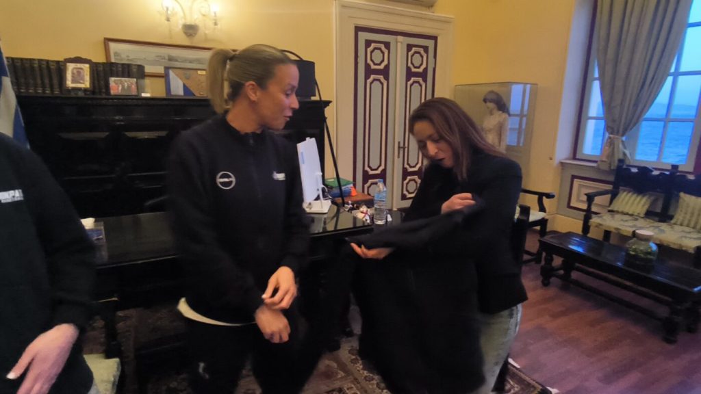 Έτσι, ανάμεσα στις προπονήσεις τους, η κ. Σβύνου τις κάλεσε στο γραφείο της και χάρισε σε κάθε μία ένα ξεχωριστό, χειροποίητο γούρι – ένα “ματάκι” – δημιουργία του δραστήριου Γυναικείου Συλλόγου Κεφάλου “Η ΓΑΙΑ”.Οι αθλήτριες, με τη σειρά τους, έδειξαν την ευγνωμοσύνη τους προσφέροντας στην Έπαρχο κ. Ντίνα Σβύνου ένα φούτερ με τα χρώματα της ομάδας τους.
