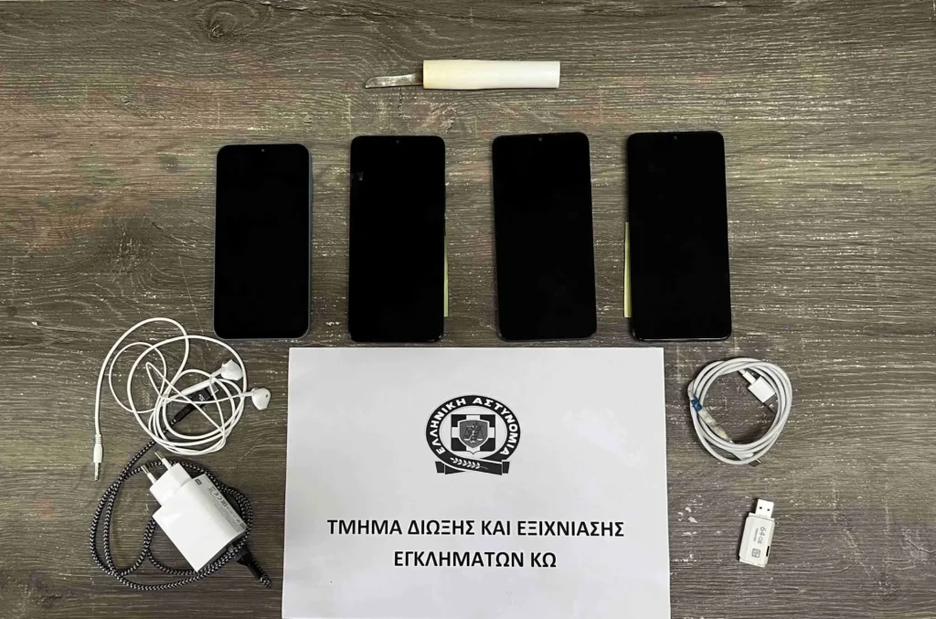 Ειδική επιχειρησιακή δράση της ΕΛ.ΑΣ. στο κατάστημα κράτησης διενεργήθηκε το απόγευμα του Σαββάτου στην Κω, από το τοπικό Τμήμα Δίωξης και Εξιχνίασης Εγκλημάτων, με τη συνδρομή αστυνομικών της Ο.Π.Κ.Ε. και ειδικά εκπαιδευμένου αστυνομικού σκύλου ανίχνευσης ναρκωτικών.Στο πλαίσιο της επιχειρησιακής αυτής δράσης που υλοποιήθηκε, παρουσία εισαγγελικού λειτουργού, εντοπίστηκαν-κατασχέθηκαν σε κοινόχρηστο χώρο και στην κατοχή 5 κρατουμένων:αυτοσχέδιο μαχαίρι με λάμα 5,5 εκατοστών4 κινητά τηλέφωνα με τα παρελκόμενα τους (φορτιστές και ακουστικά)φορητή συσκευή αποθήκευσης δεδομένων.