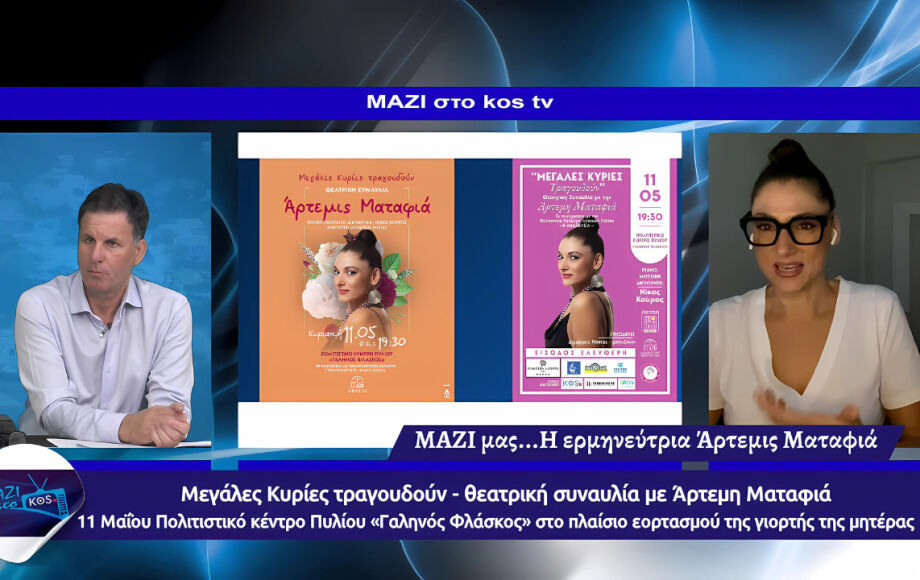 Στην εκπομπή ΜΑΖΙ στο KosTv μίλησε η ερμηνεύτρια Άρτεμις Ματαφιά με αφορμή την θεατρική συναυλία στην Κω την Κυριακή 11 Μαΐου και ώρα 19:30, στο Πολιτιστικό Κέντρο Πυλίου σε συνεργασία με τον Πολιτιστικό Σύλλογο Γυναικών Πυλίου “Η Αναξίκλεια”Η Άρτεμις Ματαφιά γεννήθηκε στην Αθήνα. Έκανε σπουδές μουσικής, μουσικής-μονωδίας στο Δημοτικό ωδείο Πρέβεζας και στην Αθήνα, στο Δημοτικό ωδείο Ζωγράφου και στο Εθνικό Ωδείο, μελετώντας παράλληλα κλασική κιθάρα και τζαζ τραγούδι.