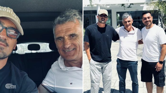 Ο προπονητής του Α.Ο Πυλίου, Σταμάτης Τογρού και ο αρχηγός του συλλόγου, Πέτρος Χατζηβασίλης είχαν την ευκαιρία να τον συναντήσουν και να φωτογραφηθούν μαζί του.