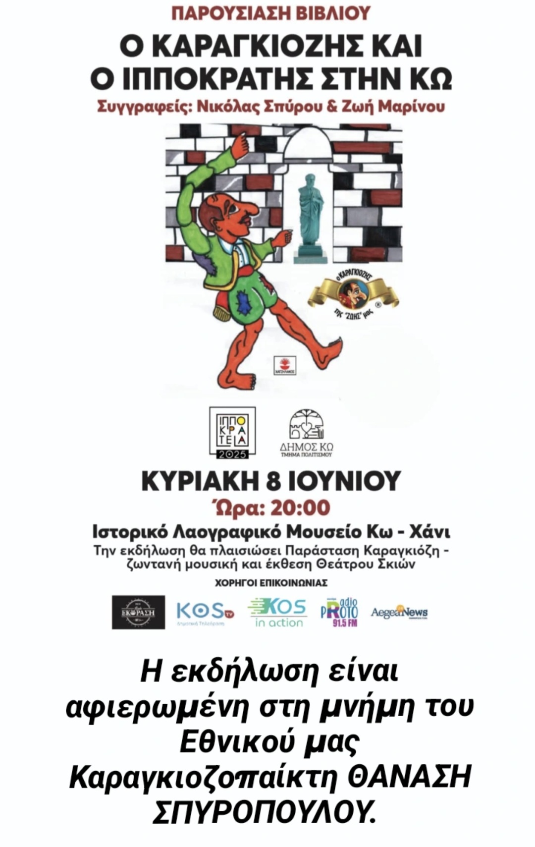 Η εκδήλωση θα πραγματοποιηθεί στις 8 Ιουνίου στον υπέροχο χώρο του Ιστορικού Λαογραφικού Μουσείου Κω Χάνι, με την ευγενική υποστήριξη του Δήμου Κω.Η βραδιά υπόσχεται να είναι μια γιορτή πολιτισμού και παράδοσης. Το κοινό θα απολαύσει μουσική, παράσταση Θεάτρου Σκιών, έκθεση παλαιών και σύγχρονων φιγούρων, καθώς και τη μεγάλη κλήρωση της πρώτης φιγούρας του Ιπποκράτη, που συνοδεύει την έκδοση του βιβλίου «Ο Καραγκιόζης και ο Ιπποκράτης στην Κω».