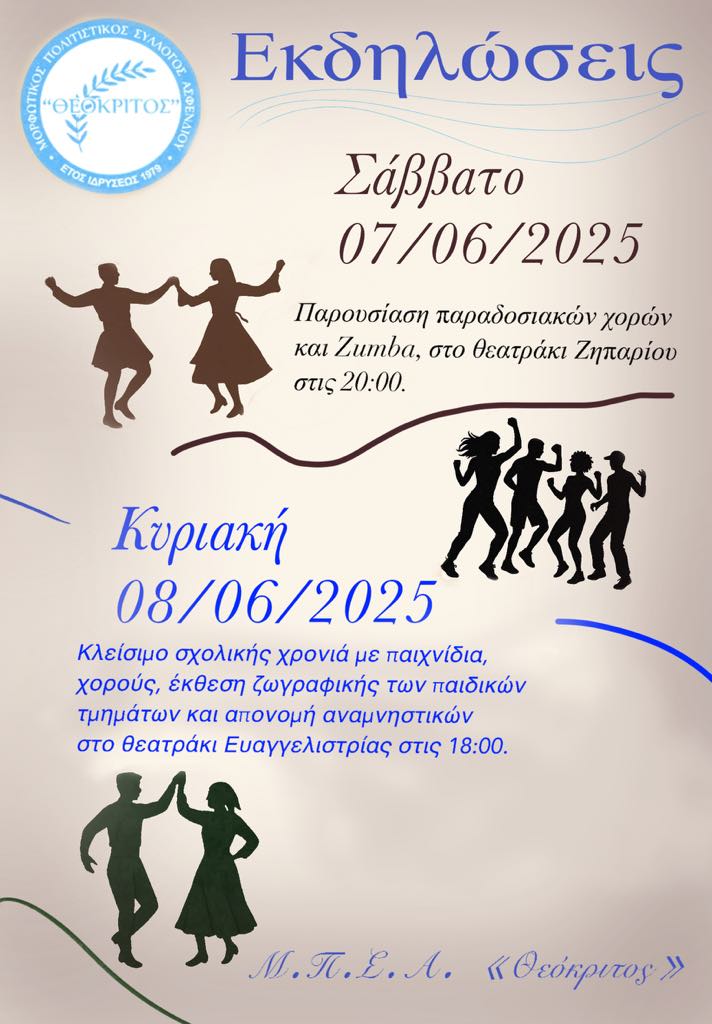 Σας προσκαλούμε στις εκδηλώσεις του Συλλόγου μας για το κλείσιμο της φετινής σχολικής χρονιάς, το Σάββατο 7 Ιουνίου, στις 20:00 στο θεατρικό Ζηπαρίου, με την παρουσίαση παραδοσιακών χώρων και Zumba και την Κυριακή 8 Ιουνίου, στο θεατράκι Ευαγγελιστρίας στις 18:00 με παιχνίδια, χορούς, έκθεση ζωγραφικής των παιδικών τμημάτων μας και απονομή αναμνηστικών στους μικρούς μαθητές μας.