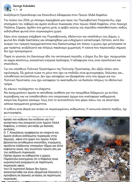 ‘’ Η δημοτική αρχή του κ.Νικηταρά γνώριζε και ανεχόταν την ανεξέλεγκτη κατάσταση με την παράνομη χωματερή που είχε δημιουργηθεί στην Κέφαλο .Ο δημοτικός σύμβουλος της παράταξης μας Γιώργος Κοκκαλάκης είχε προειδοποιήσει για τους κινδύνους ,εγγράφως, με επιστολή του στην Πυροσβεστική Υπηρεσία.Σήμερα εκδηλώθηκε πυρκαγιά , η οποία ευτυχώς αντιμετωπίστηκε. Ο κίνδυνος όμως παραμένει.