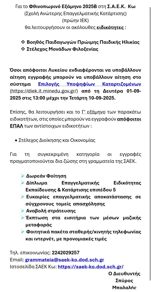 Όπως ανέφερε στο kosinaction.gr o Διευθυντής της Σ.Α.Ε.Κ. Κω, κ. Σπύρος Μπαλαλής, οι αιτήσεις για τις νέες ειδικότητες υποβάλλονται αποκλειστικά ηλεκτρονικά μέσω της πλατφόρμας diek.it.minedu.gov.gr, με καταληκτική ημερομηνία την Παρασκευή 12 Σεπτεμβρίου 2025 και ώρα 15:00.Η φοίτηση στις Σ.Α.Ε.Κ. του Υπουργείου Παιδείας είναι δωρεάν και οδηγεί στην απόκτηση Διπλώματος Επαγγελματικής Ειδικότητας επιπέδου 5, προσφέροντας σημαντικές επαγγελματικές προοπτικές.