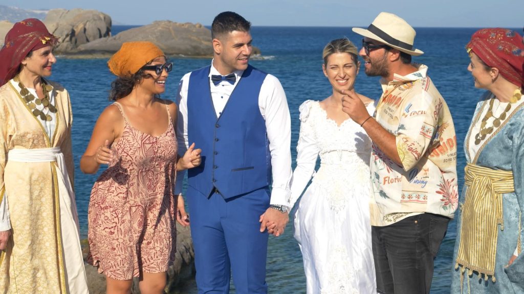 Παραδοσιακός, νησιώτικος γάμος. Και είμαστε όλοι καλεσμένοι. Ο Γιάννης θα ξυρίσει τον γαμπρό και η Πηνελόπη θα συνοδεύσει εν πλω τη νύφη. Και το γλέντι τώρα αρχίζει…