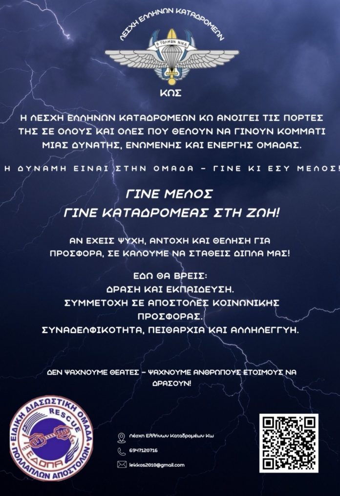 Η Λέσχη Ελλήνων Καταδρομέων Κω ανοίγει τις πόρτες της σε όλους και όλες που θέλουν να γίνουν κομμάτι μιας δυνατής, ενωμένης και ενεργής ομάδας.Αν έχεις ψυχή, αντοχή και θέληση για προσφορά, σε καλούμε να σταθείς δίπλα μας!👉 Γίνε μέλος σήμερα και πάρε θέση στην ομάδα μας!Η ΔΥΝΑΜΗ ΕΙΝΑΙ ΣΤΗΝ ΟΜΑΔΑ – ΓΙΝΕ ΚΙ ΕΣΥ ΜΕΛΟΣ!Εδώ θα βρεις:Δράση και εκπαίδευση.Συμμετοχή σε αποστολές κοινωνικής προσφοράς.Συναδελφικότητα, πειθαρχία και αλληλεγγύη.⚡ ΔΕΝ ΨΑΧΝΟΥΜΕ ΘΕΑΤΕΣ – ΨΑΧΝΟΥΜΕ ΑΝΘΡΩΠΟΥΣ ΕΤΟΙΜΟΥΣ ΝΑ ΔΡΑΣΟΥΝ! ⚡ΓΙΝΕ ΜΕΛΟΣ – ΓΙΝΕ ΚΑΤΑΔΡΟΜΕΑΣ ΣΤΗ ΖΩΗ!!!📍 Λέσχη Ελλήνων Καταδρομέων Κω📞 6947120716📧 [email protected]