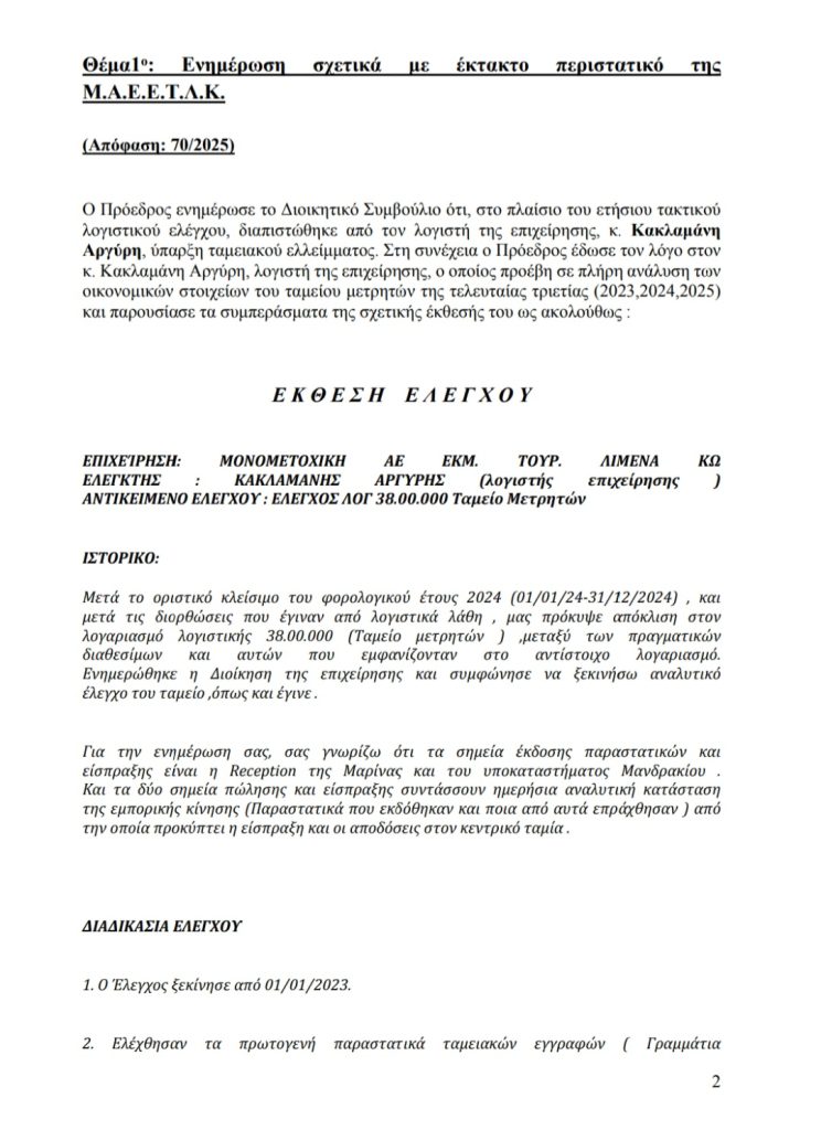 Σύμφωνα με την έκθεση του λογιστή της επιχείρησης, κ. Αργύρη Κακλαμάνη, ο αναλυτικός έλεγχος του ταμείου για την τριετία 2023–2025 αποκάλυψε συνολική διαφορά ύψους 117.920,50 ευρώ, που προέρχεται κυρίως από αλλοίωση υπολοίπων στις ταμειακές καταστάσεις του κεντρικού ταμία.