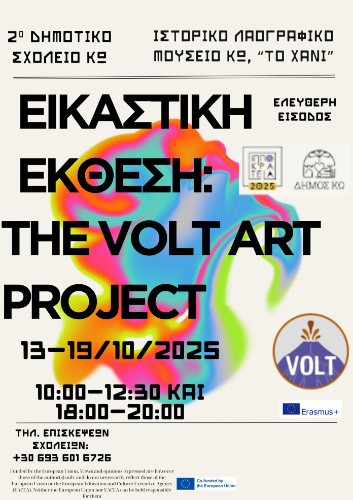 Σας γνωστοποιούμε ότι η ημερομηνία έναρξης της εικαστικής έκθεσης με θέμα τα ηφαίστεια της Κω και Νισύρου με τίτλο “THE VOLT ARTPROJECT” ( 2ο Δημοτικό Σχολείο Κω- Ευρωπαϊκό πρόγραμμα Erasmus+”VOLT-Volcanoes As Teachers”- “Τα Ηφαίστεια ως Δάσκαλοι”) η οποία θα πραγματοποιηθεί στα πλαίσια των Καλοκαιρινών Ιπποκρατείων 2025 στο Ιστορικό Λαογραφικό Μουσείο “Χάνι” μεταφέρεται στις 13/10/ 2025, λόγω έκτακτου τεχνικού προβλήματος.