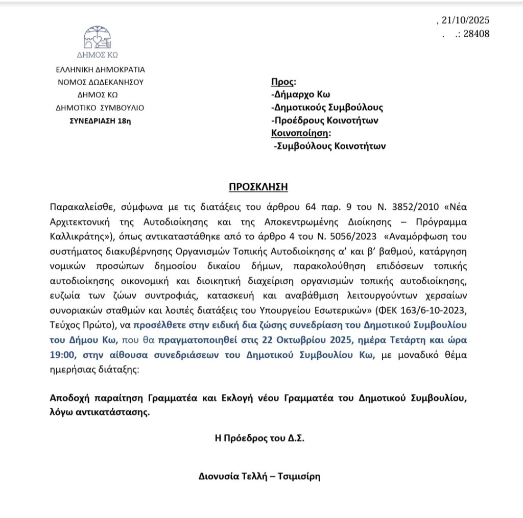 Σύμφωνα με πληροφορίες, η γραμματέας του Δημοτικού Συμβουλίου Κω, Διονυσία Γιαννούλη, υπέβαλε επιστολή παραίτησης από τη θεσμική της θέση προς την πρόεδρο του σώματος, Διονυσία Τελλή. Η κ. Γιαννούλη παραμένει στη θέση της δημοτικής συμβούλου, ωστόσο αποχωρεί από τα καθήκοντά της ως γραμματέας του συμβουλίου.Η εξέλιξη αυτή έρχεται σε μια περίοδο όπου στο εσωτερικό της δημοτικής αρχής επικρατεί έντονη κινητικότητα και αναμονή, ενόψει του δεύτερου ανασχηματισμού που είχε προαναγγείλει ο δήμαρχος. Υπενθυμίζεται ότι πριν από περίπου ενάμιση μήνα, ο δήμαρχος είχε ανακοινώσει έναν πρώτο ανασχηματισμό, στον οποίο —μεταξύ άλλων— η κ. Βουκελάτου αντικαταστάθηκε από τον Θεοφιλίδη.Παρά την τότε εξαγγελία για έναν δεύτερο κύκλο αλλαγών, έχουν περάσει σχεδόν δύο εβδομάδες χωρίς εμφανή κινητικότητα, γεγονός που έχει εντείνει τη φημολογία για εσωτερικές ανακατατάξεις και επαναπροσδιορισμό ισορροπιών.Η παραίτηση της κ. Γιαννούλη φαίνεται να ενισχύει την αίσθηση ρευστότητας στο εσωτερικό της δημοτικής αρχής, ενώ δεν έχει ακόμη αποσαφηνιστεί αν η απόφασή της σχετίζεται άμεσα με αυτές τις εσωτερικές διεργασίες ή αν πρόκειται για προσωπική επιλογή.Προς το παρόν, καμία επίσημη δήλωση δεν έχει γίνει από την ίδια ή από τη δημοτική αρχή σχετικά με τους λόγους της παραίτησης.