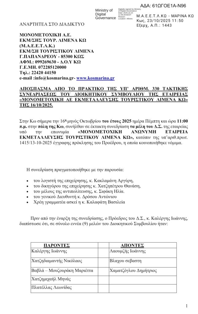 Αναρτήθηκε σήμερα στη Διαύγεια η απόφαση του Διοικητικού Συμβουλίου της Μονομετοχικής Α.Ε. Εκμετάλλευσης Τουριστικού Λιμένα Κω (Μ.Α.Ε. Ε.Τ.Λ.Κ.), με την οποία εγκρίνεται η υποβολή έγκλησης για υπεξαίρεση ιδιαίτερα μεγάλης αξίας κατ’ εξακολούθηση από διαχειριστή ξένης περιουσίας.