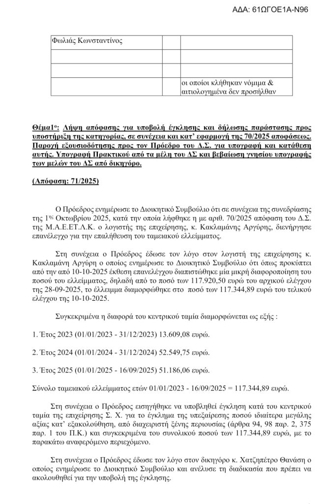 Αξίζει να επισημανθεί ότι το Διοικητικό Συμβούλιο προχωρά στην υποβολή έγκλησης χωρίς να έχει προηγηθεί το επίσημο πόρισμα του ορκωτού λογιστή, ο οποίος όπως είχε ανακοινώσει ο Δήμαρχος στη συνέντευξη τύπου στις 2 Οκτωβρίου, δεν έχει ακόμη οριστεί.
