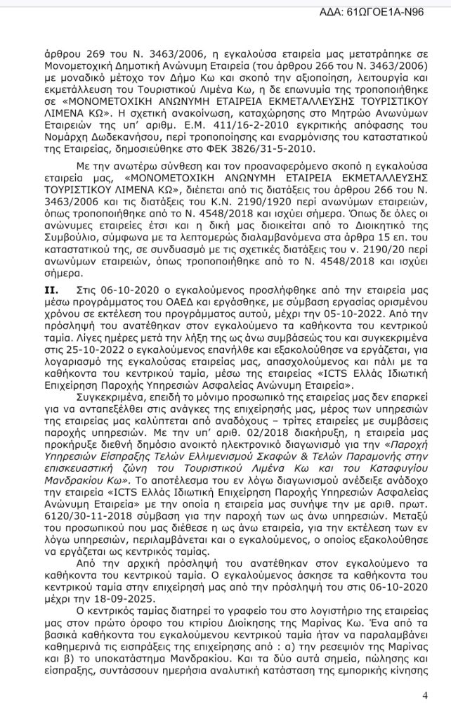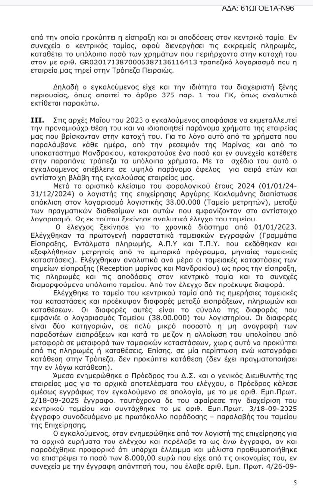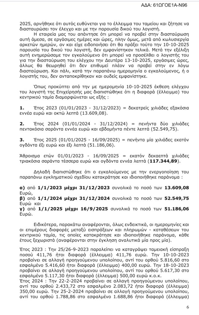 Η εταιρεία καταγγέλλει ότι ο κεντρικός ταμίας της εταιρείας, κ. Σ. Χ., φέρεται να προέβη σε πράξεις μείωσης των εισπράξεων που όφειλαν να αποδοθούν στην εταιρεία από τον Μάιο του 2023 και μετά.