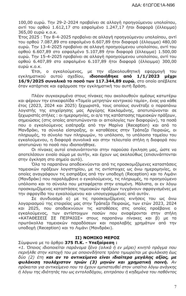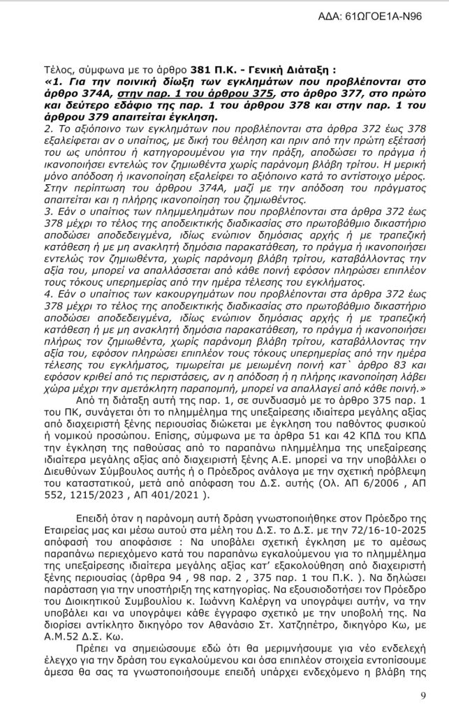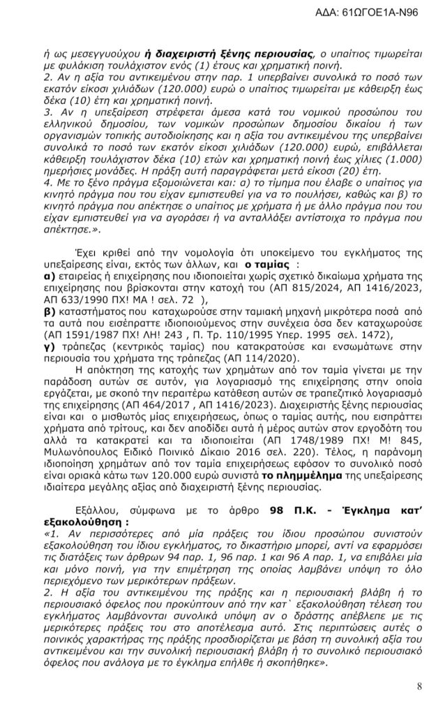 Η απόφαση επικαλείται τις διατάξεις των άρθρων 94, 98 παρ. 2 και 375 παρ. 1 του Ποινικού Κώδικα, ενώ η εταιρεία δηλώνει ότι διατηρεί δικαίωμα αστικών αξιώσεων για την αποκατάσταση της ζημίας.