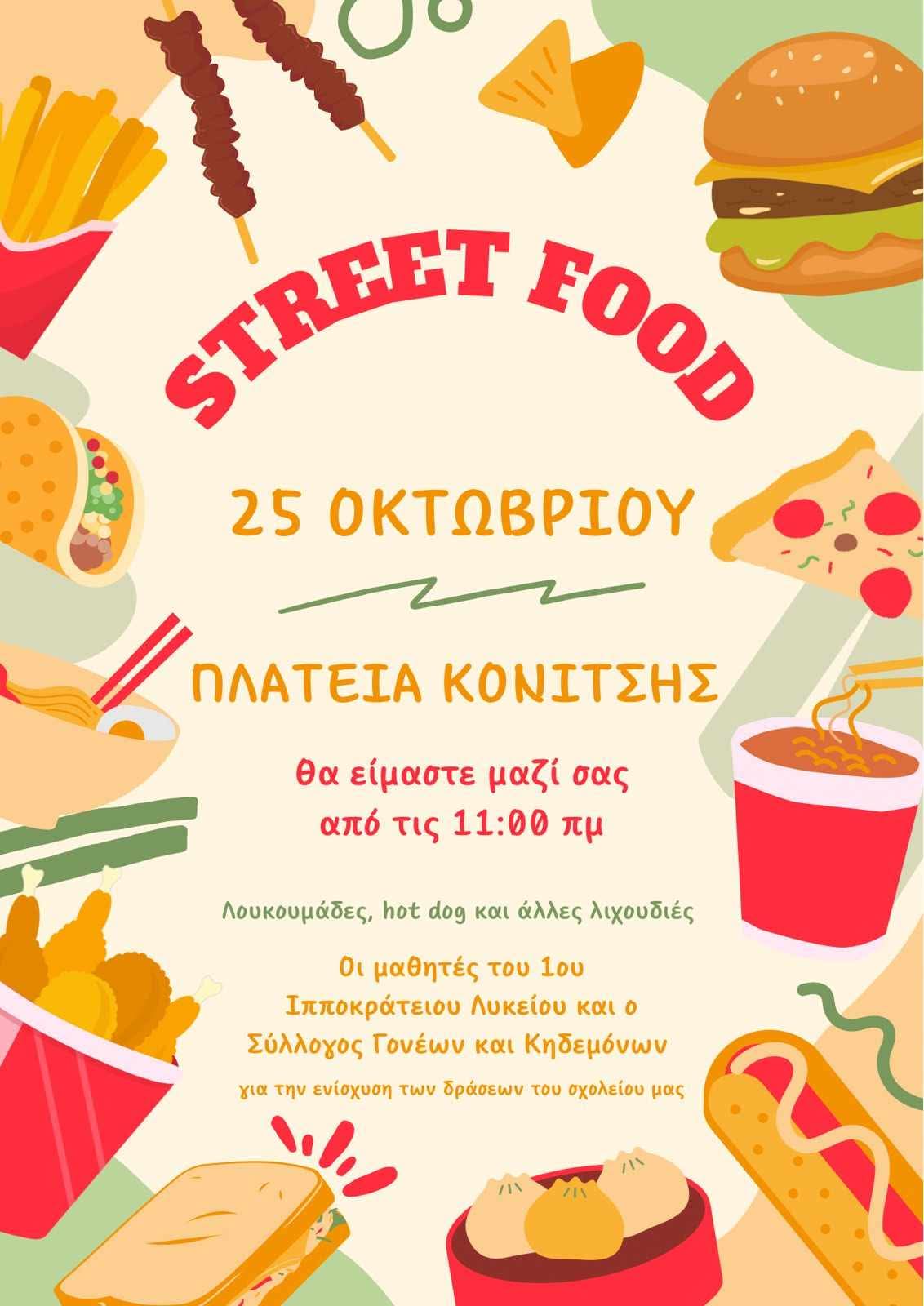 Το Σάββατο 25 Οκτωβρίου, η Πλατεία Κόνιτσης θα γεμίσει με αρώματα, γεύσεις και χαμόγελα! Οι μαθητές του 1ου Ιπποκράτειου Λυκείου σε συνεργασία με τον Σύλλογο Γονέων και Κηδεμόνων διοργανώνουν μια ξεχωριστή γιορτή Street Food, με στόχο την ενίσχυση των δράσεων του σχολείου.