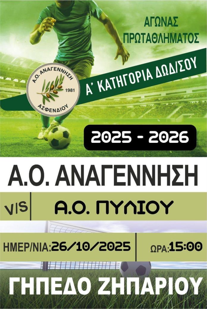 Για την 5η αγωνιστική της Α’ Κατηγορίας Δωδεκανήσου, η Αναγέννηση Ασφενδιού θα αντιμετωπίσει την Κυριακή 26 Οκτωβρίου στις 15:00 τον Α.Ο. Πυλίου, σε ένα από τα πιο ενδιαφέροντα τοπικά ντέρμπι της σεζόν.