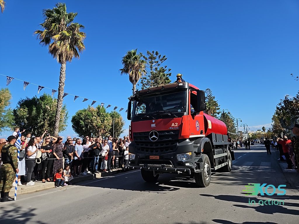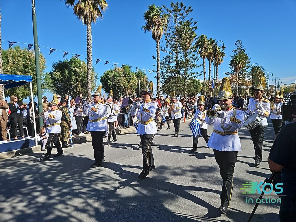 Στη συνέχεια, την παρέλαση των ενόπλων και υπηρεσιακών σωμάτων άνοιξε η Φιλαρμονική της 80 ΑΔΤΕ, επικεφαλής των μηχανοκίνητων τμημάτων της Ελληνικής Αστυνομίας, του Λιμενικού Σώματος, της Πυροσβεστικής Υπηρεσίας και των οχημάτων της Πολιτικής Προστασίας του Δήμου Κω.