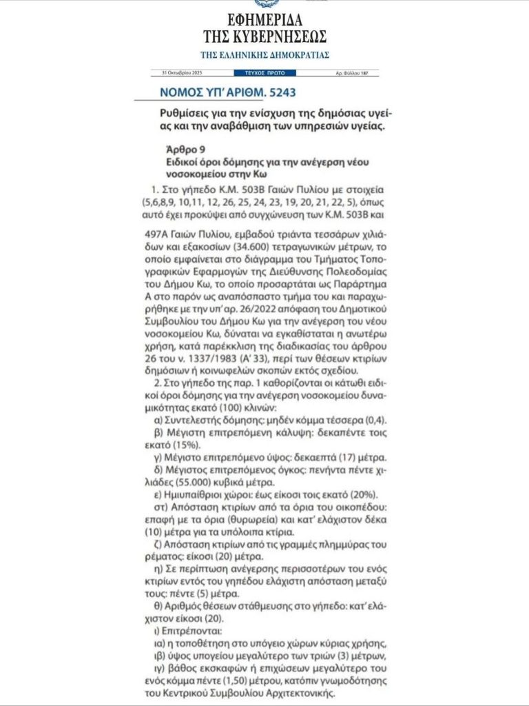🏛️ Η ψήφιση και η έκδοση σε Φ.Ε.Κ του νομοσχεδίου του Υπουργείου Υγείας, που περιλαμβάνει ειδικό άρθρο για την ανέγερση νέου Νοσοκομείου στην Κω, αποτελεί ιστορική στιγμή για το νησί μας.