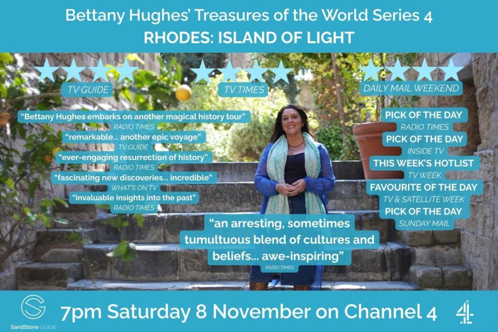 H διάσημη ιστορικός, συγγραφέας και τηλεοπτική παραγωγός Bettany Hughes, γνωστή για τη βραβευμένη σειρά ντοκιμαντέρ «Treasures of the World» («Θησαυροί του Κόσμου»), που προβάλλεται στο Channel 4 του Ηνωμένου Βασιλείου, καθώς και σε περισσότερα από 120 τηλεοπτικά δίκτυα και στη συνδρομητική πλατφόρμα Apple TV, παρουσίασε το Σάββατο 8 Νοεμβρίου 2025, το νέο της επεισόδιο αφιερωμένο στη Ρόδο, με τίτλο «Rhodes: Island of Light» («Ρόδος: το Νησί του Φωτός»).