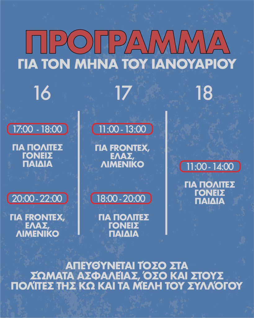 Πέμπτη 16 Ιανουαρίου, 17.00 με 18.00 για πολίτες, γονείς και παιδιά. 20.00 με 22.00 για Frontex, Ελληνική Αστυνομία και Λιμενικό.