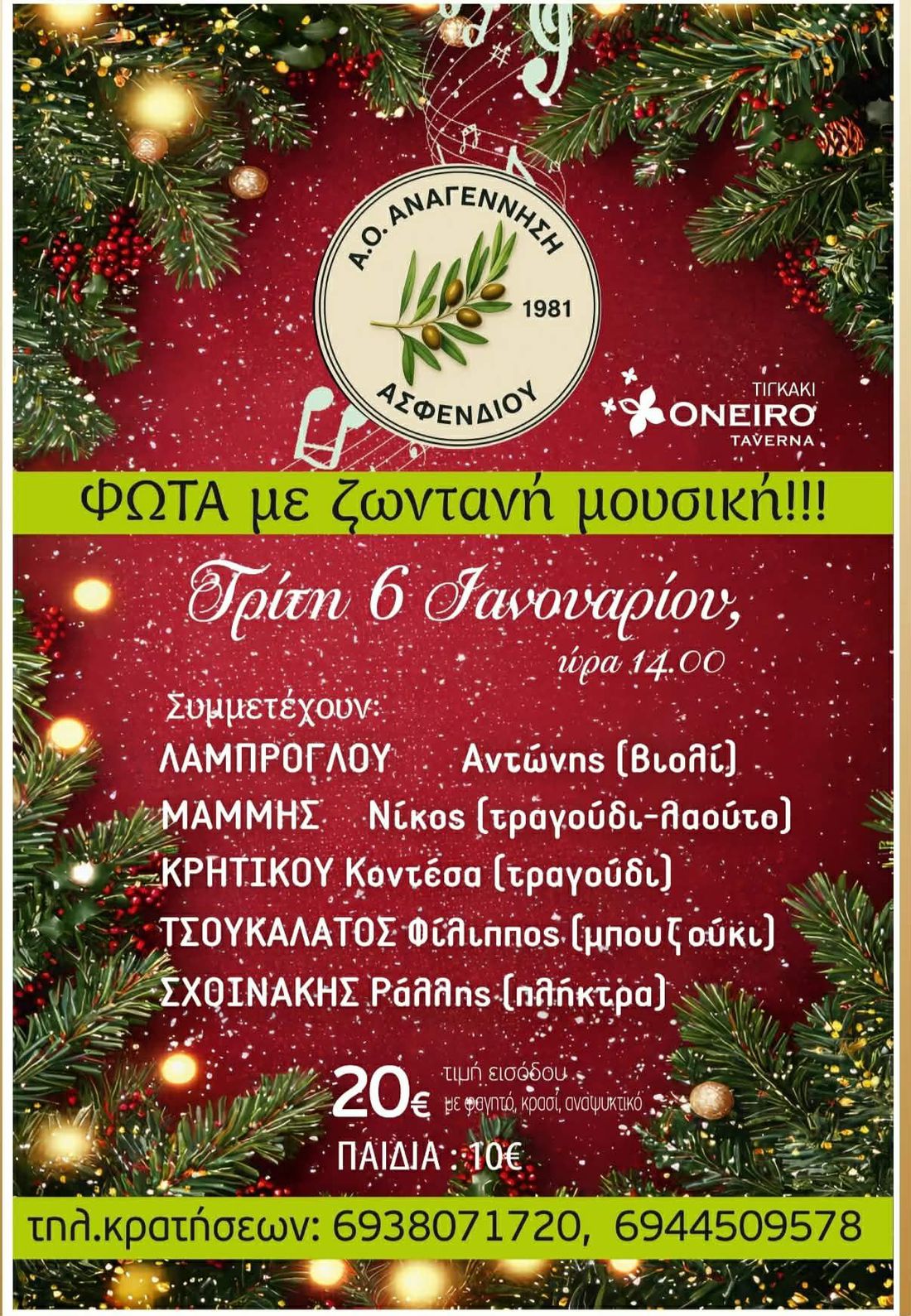 Ο Α.Ο. Αναγέννηση Ασφενδιού σας προσκαλεί να γιορτάσουμε όλοι μαζί τα Φώτα με ζωντανή μουσική, κέφι και καλή παρέα, την Τρίτη 6 Ιανουαρίου, στις 14:00, στο Τιγκάκι Oneiro Taverna.