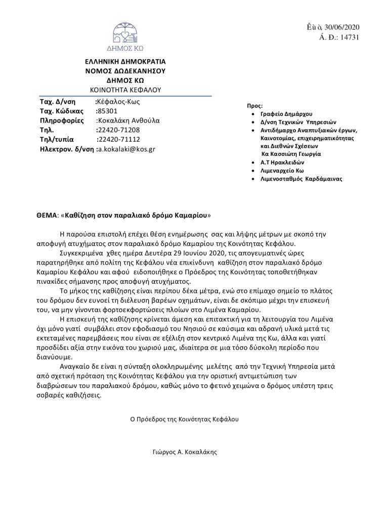 Σοβαρές ευθύνες στη δημοτική αρχή για τη συνεχιζόμενη καθίζηση στον παραλιακό δρόμο στο Καμάρι Κεφάλου αποδίδει ο δημοτικός σύμβουλος Κω και πρώην πρόεδρος Κεφάλου Γιώργος Κοκαλάκης, μιλώντας για ένα χρόνιο πρόβλημα που, παρά τις αλλεπάλληλες προειδοποιήσεις, παραμένει άλυτο και πλέον απειλεί ευθέως την ασφάλεια κατοίκων και επισκεπτών.
