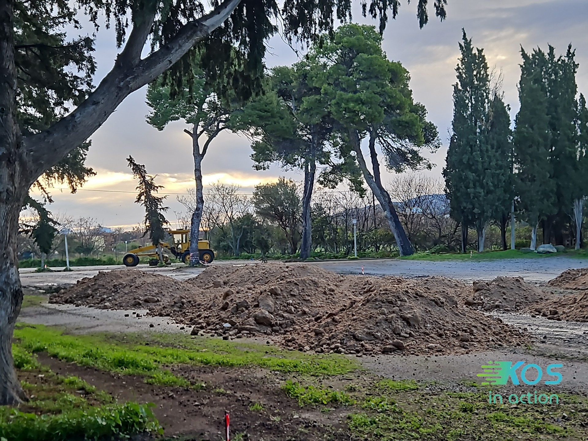 Οι παρεμβάσεις περιλαμβάνουν επίσης την εξομάλυνση των υφιστάμενων χωμάτινων επιφανειών, με διάστρωση και συμπύκνωση αδρανούς υλικού τύπου 3Α, ενώ η τελική επιφάνεια θα επιστρωθεί με σταμπωτό σκυρόδεμα σε γήινες αποχρώσεις, ώστε να εναρμονίζεται με το περιβάλλον.